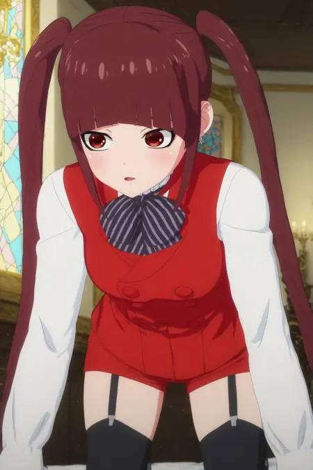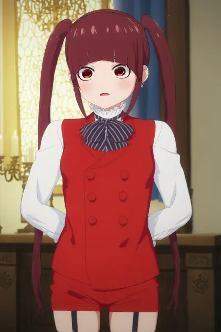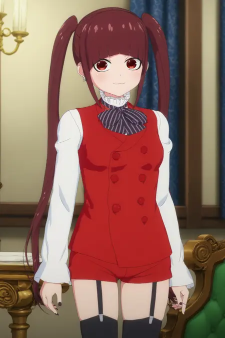 트리거: viola,1girl,solo,breasts,twintails,long_hair, earrings, jewelry, bow,bangs,blunt_bangs, thighhighs,garter straps,black thighhighs,red shorts,long_sleeves, school uniform,red vest,nail polish,shirt,red dress