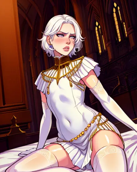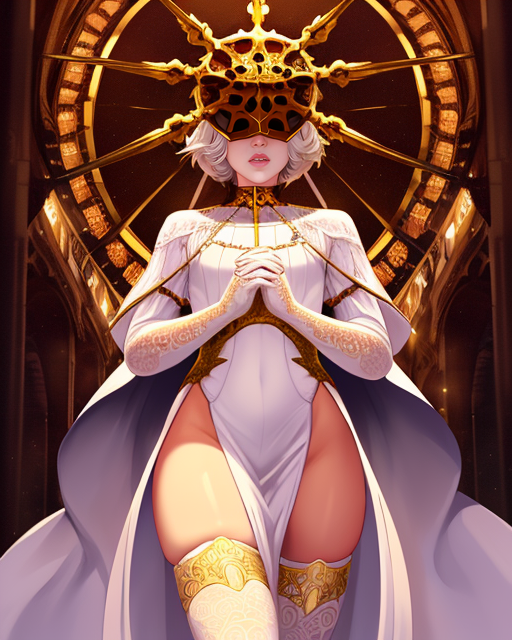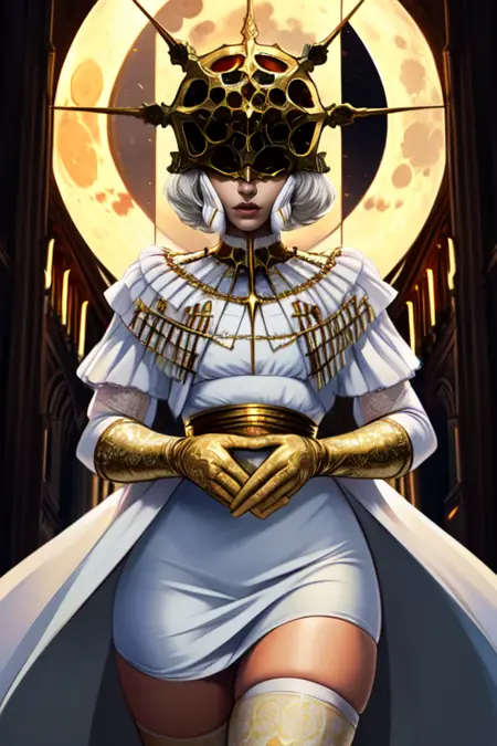 gold jewelry, white dress, long sleeves, gold mask, - more default