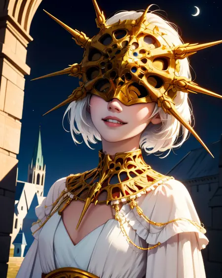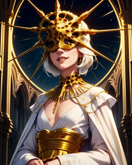 gold jewelry, white dress, long sleeves, gold mask, - more default