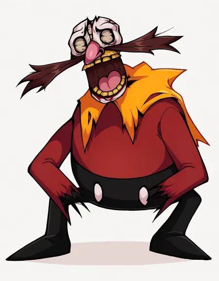 SoulEggmanEXEFNF, 1boy, pale Skin, head is split open, brain, jaw hangs open limply, yellow teeth, blood drips from eyes, yellow collar is torn, torned clothes, both hands are gone, red shirt, black leggings, horror, mustache, pink nose, fat, chubby