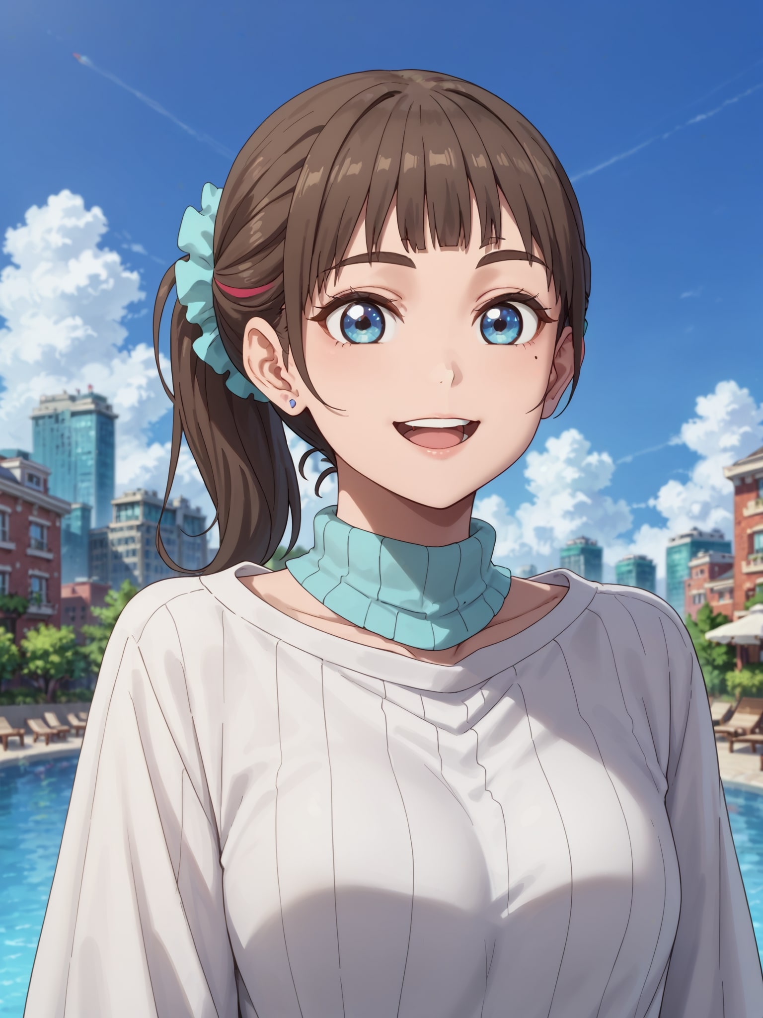 mengmeng、茶色の髪、青い目、ストライプ入りの髪、ポニーテール、スランチ、アクア色のスランチ、ほくろ、目の下のほくろ、黒のショートパンツ、白のシャツ、青のアンダーシャツ、ネックレス