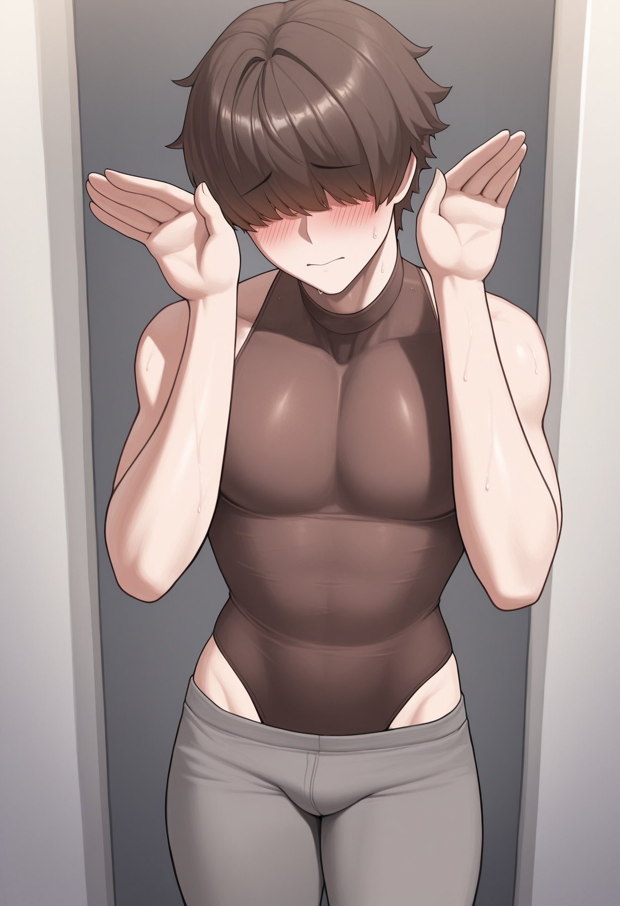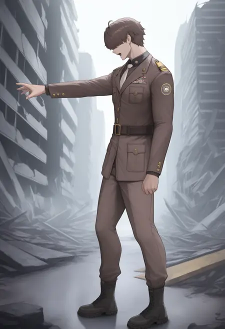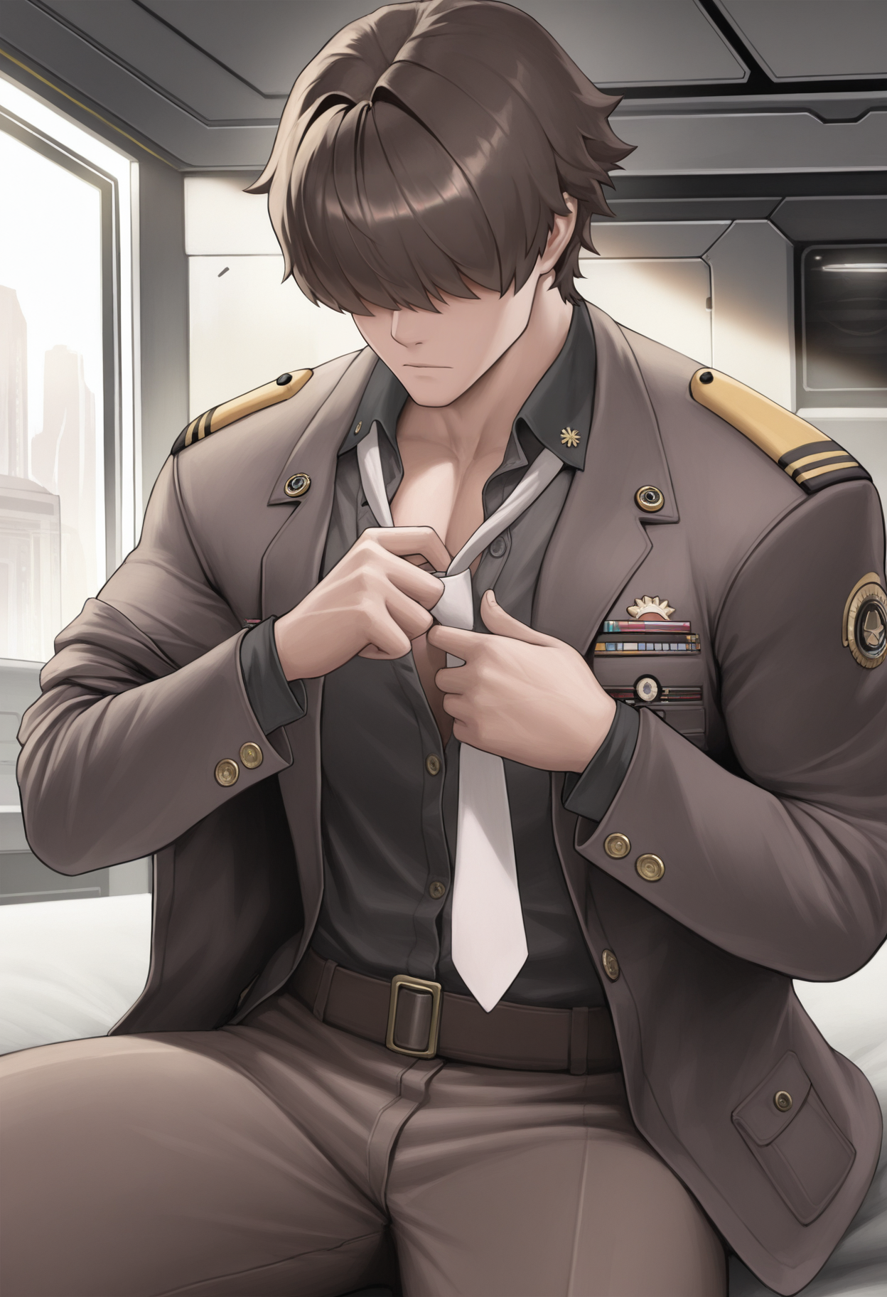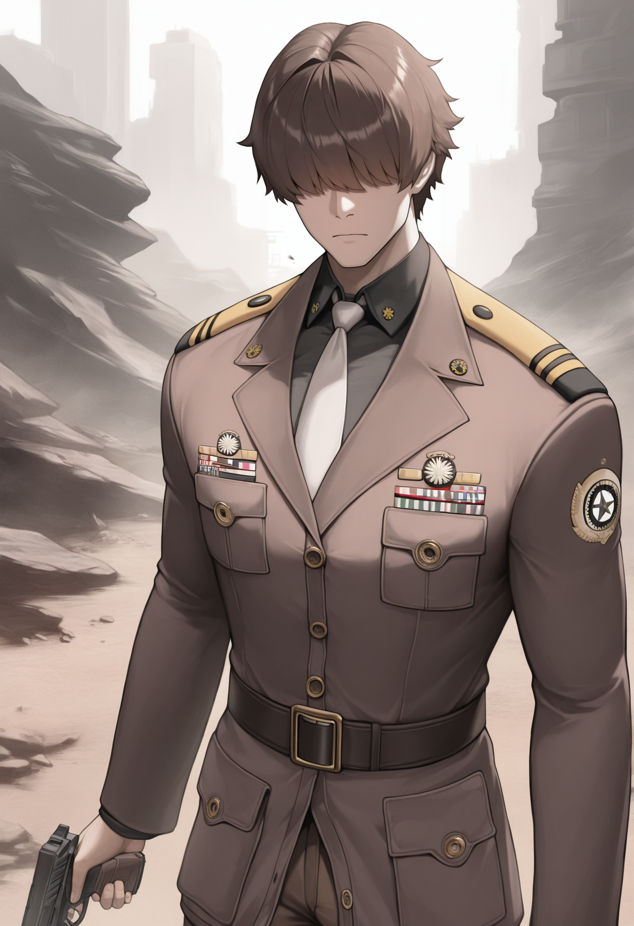 nikke-commander,头发遮住眼睛,棕发,短发,棕色夹克,军装,白色领带,棕色长裤,黑色衬衫