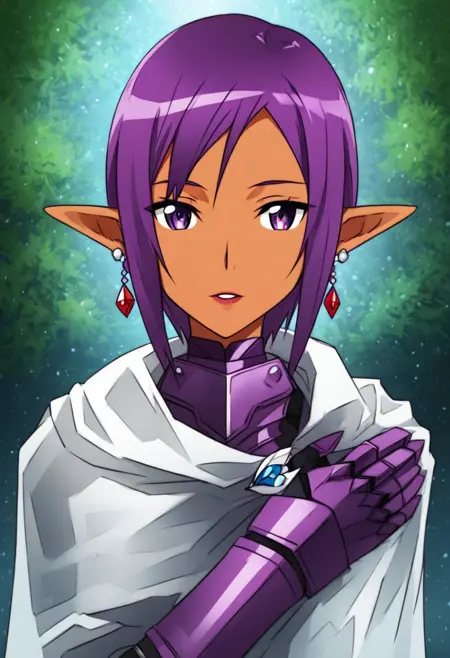 Kizmel, Short Purple hair, Purple eyes, elf ears, large breasts, medium breasts,