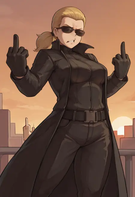 服装标签:太阳镜,黑色手套,黑色外套,腰带,黑色裤子,长外套