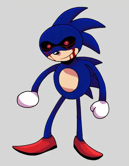 SanicEXEFNF, 1boy, crudely drawn, Sonic the Hedgehog, black sclera, colored sclera, red eyes, bloody tears, dark blue fur, white round gloves, red shoes, horror, black nose