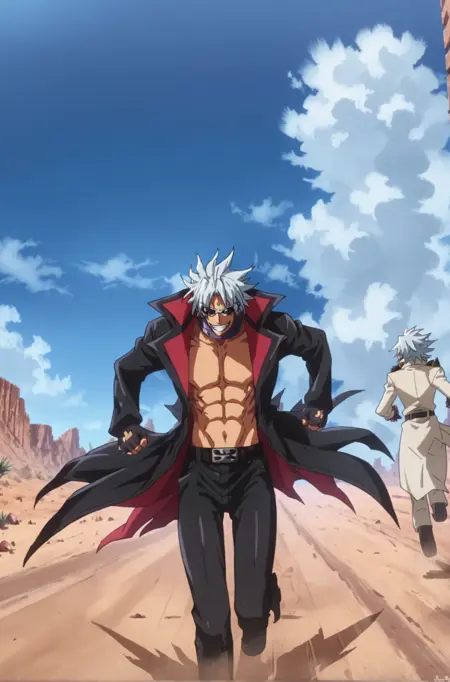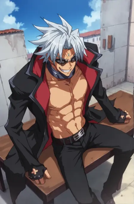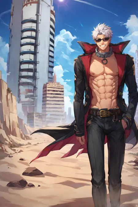 The recommended prompt is adam_blade_76, sun glasses, sunglasses, belt, open clothes, white hair, jacked, coat, open coat, collar, bindi, abs, muscular, muscle, long jacked, holy crose (yes, I wrote it wrong).