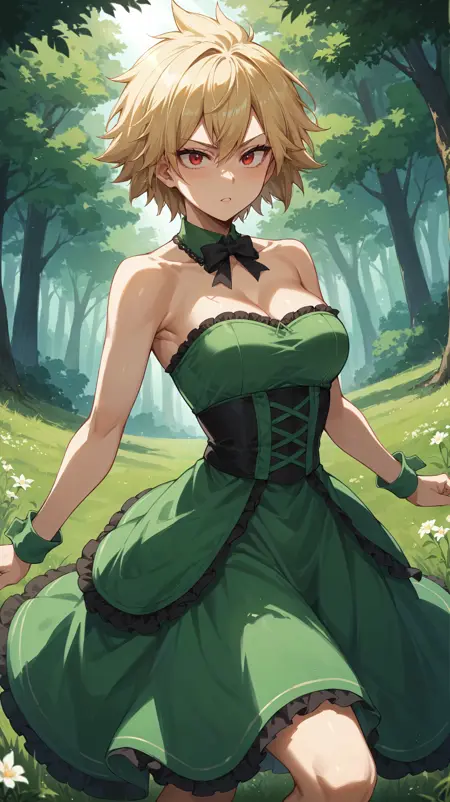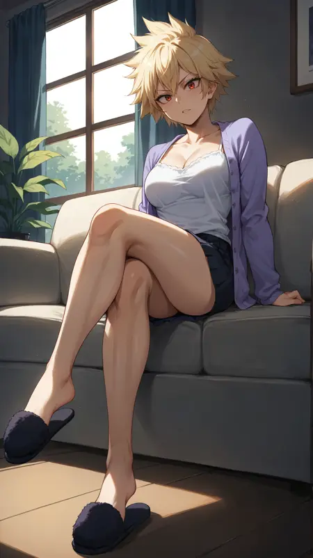 short hair, yellow hair, spiked hair, red eyes, purple cardigan, white camisole, black miniskirt,