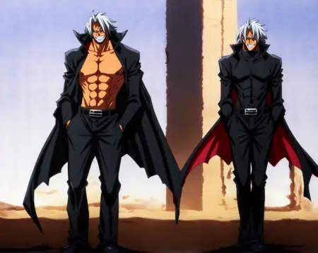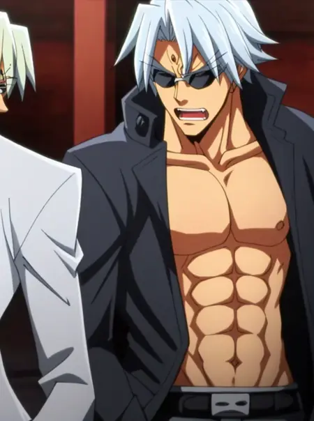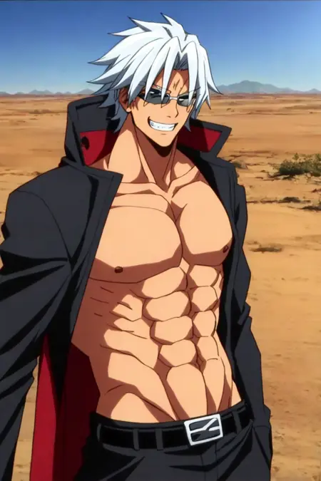 The recommended prompt is adam_blade_76, sun glasses, sunglasses, belt, open clothes, white hair, jacked, coat, open coat, collar, bindi, abs, muscular, muscle, long jacked, holy crose (yes, I wrote it wrong).