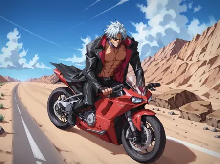 이 캐릭터를 얻으려면 다음과 같은 프롬프트를 사용하세요: 검은 재킷, 안경, 벨트, 흰색 머리, 근육, 남성