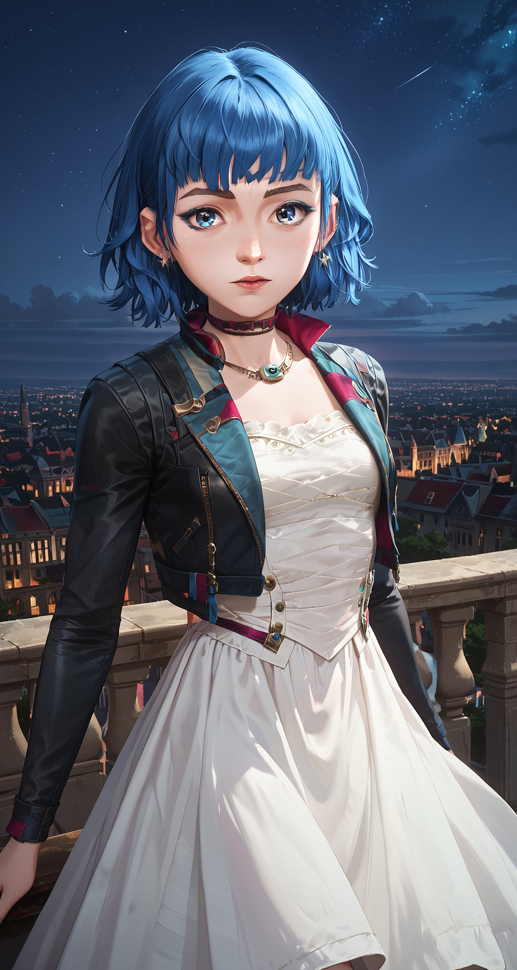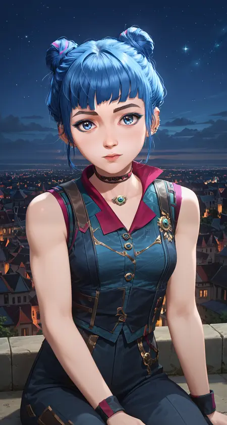 powder_arcane_s2,蓝色头发,短发,双丸子头,刘海,蓝眼睛,眼线,蓝色眼线,珠宝,耳环,妆容,项圈,
