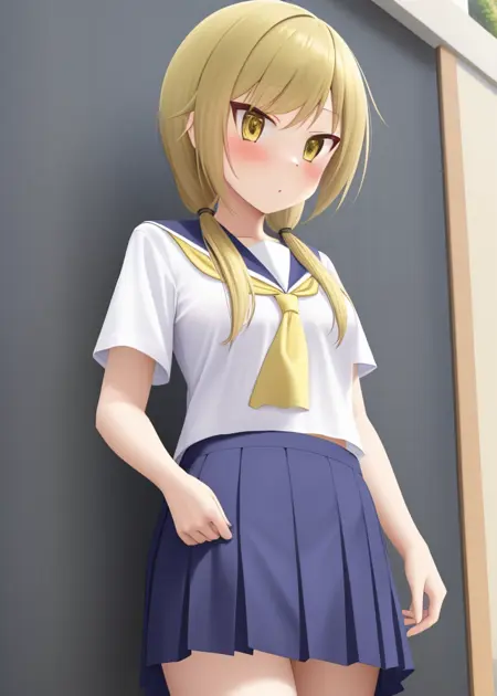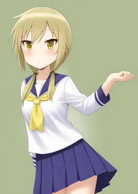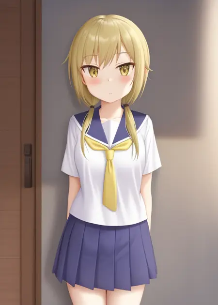 1girl, solo, long hair, blonde hair, twintails, school uniform, yellow eyes, pleated skirt, serafuku, low twintails, blue sailor collar