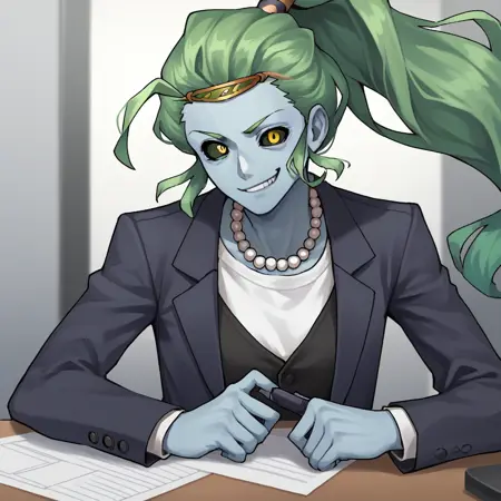 green hair, ponytail, colored sclera, yellow eyes, blue skin, bat wing, single wing, ancient greek clothes