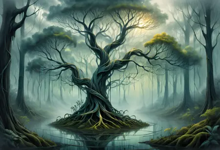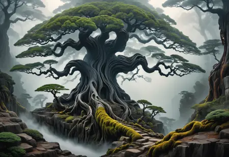 • "a mystical tree surrounded by fog"