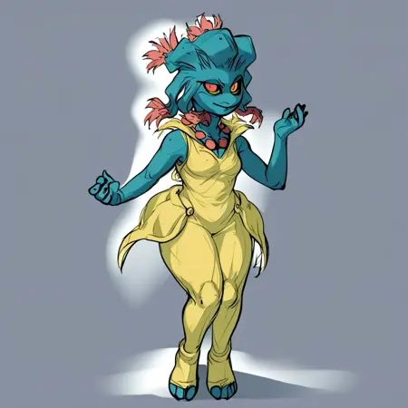 태그: ourimis, score_9, source_furry, solo, 풀 바디, 1girl, 색상이 있는 피부, 다색 머리카락, 색상이 있는 공막, 빨간 눈, 스카우터, 구슬 목걸이, 포켓몬(생물)