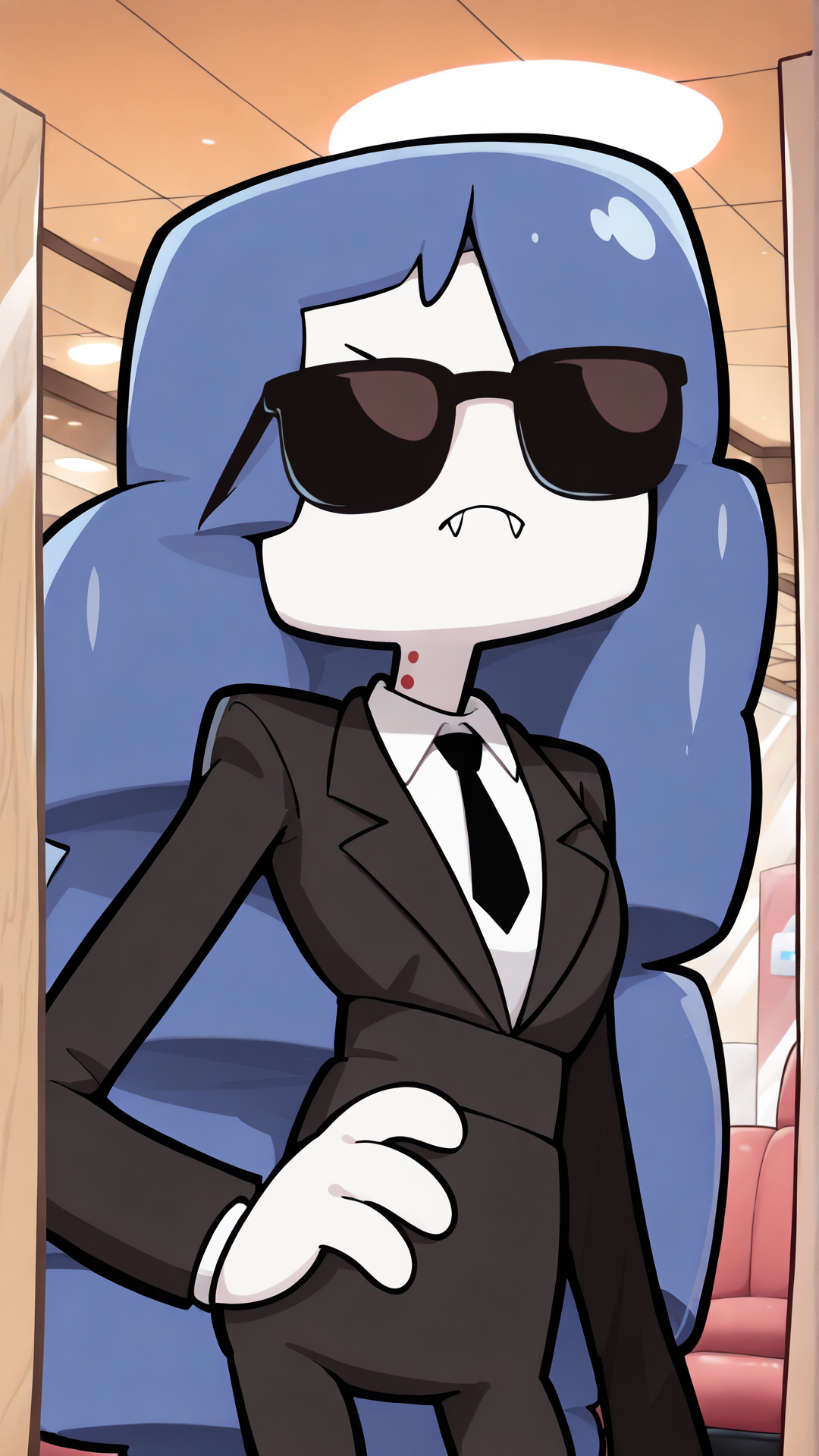 Marshmaline: (marshmaline, 1girl, solo, very long hair, blue hair, black eyes, solid circle eyes, fangs, white skin), (hat, pink shirt, light blue jeans, red boots)