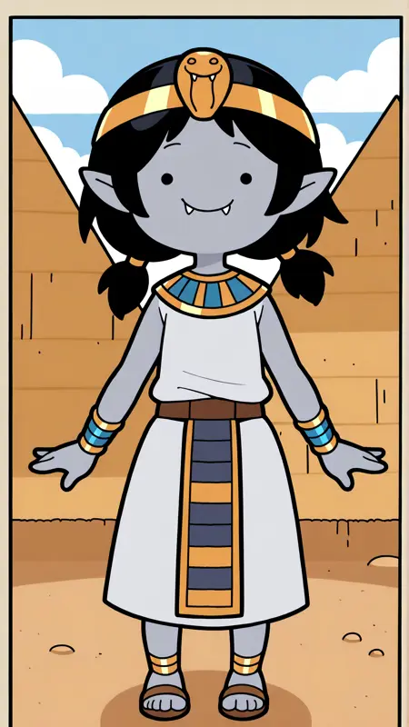Little Marceline: (atmarcy, 1girl, chibi, solo, short hair, black hair, pointy ears, black eyes, solid circle eyes, fangs, grey skin), (blue overall skirt, red shirt, socks, shoes)