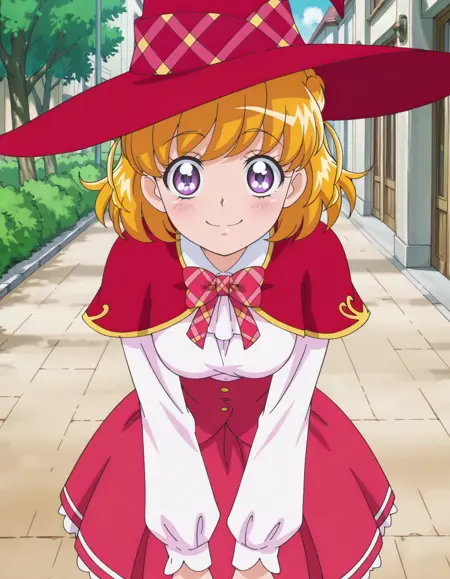 score_9, score_8_up, score_7_up, anime screencap, solo,1girl,asahinamirai, 紫の目, 金色の髪, 学校制服, 女の魔法使い, ピンクの魔法使いの帽子, ピンクのスカート, ケープレット, lora:asahinamirai:0.8