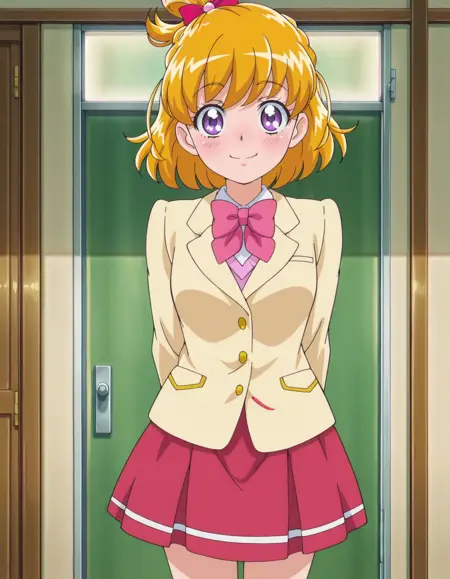 score_9, score_8_up, score_7_up, anime screencap, solo,1girl,asahinamirai, 紫の目, 金色の髪, ピンクのボウタイ, 学校制服, 黄色いブレザー, ピンクのスカート, lora:asahinamirai:0.8