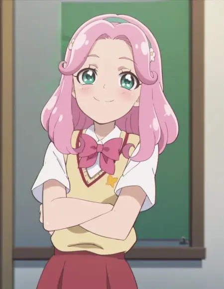 score_9, score_8_up, score_7_up, anime screencap, solo,1girl,hanamikotoha, green eyes,pink hair,school uniform,pink bow,red skirt, hairband, sweater vest,lora:hanamikotoha:0.8