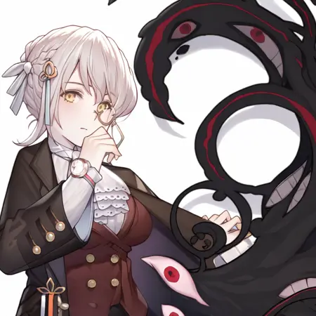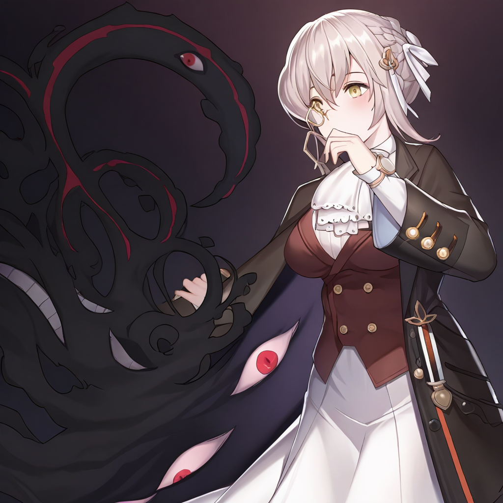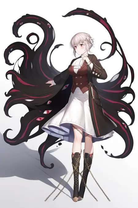 활성화 태그: "edel_meitner, 1girl, boots, solo, chain, skirt, white skirt, long sleeves, black footwear, white ascot, knee boots, tentacles, ascot, short hair, vest, hair ornament, yellow eyes, cross-laced footwear, bangs, jacket, shirt, defaultoutfit"