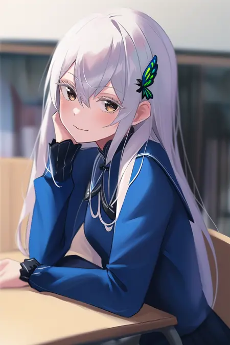Default outfit: butterfly hair ornament, black capelet, black dress, long sleeves,