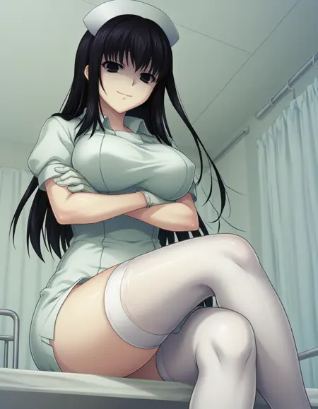 간호사, 간호사 모자, 반팔, 장갑, 흰색 허벅지까지 긴 양말