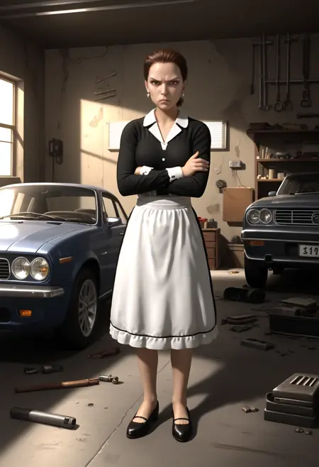 来自 cult 经典 2012 年恐怖游戏《Lucius》的另一位女仆。主提示为 "JovitaL1,深色皮肤,短发,棕色头发,短马尾",服装为 "衬衫,裙子,围裙,女仆"。