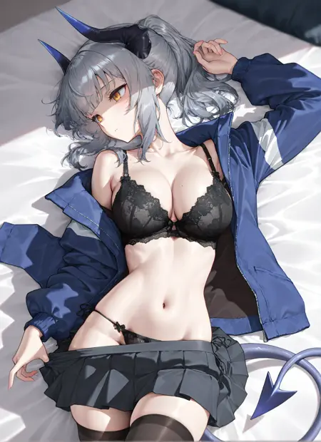 1girl, liskarm, 꼬리, 뿔, 회색 머리, 단발머리, 앞머리, 측면 머리카락,