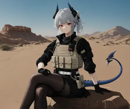 오버드레스, 긴 소매, 총알 방탄조끼, 홀스터, 장갑, 검은 팬티스타킹, 허벅지 스트랩,