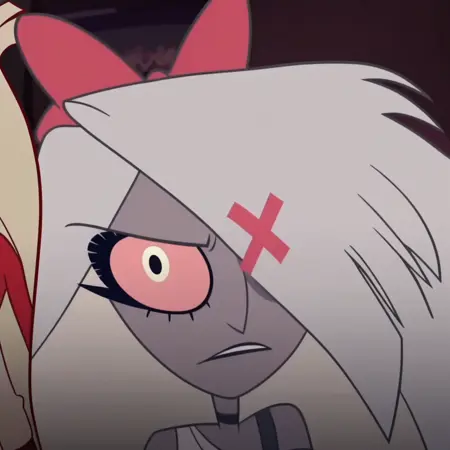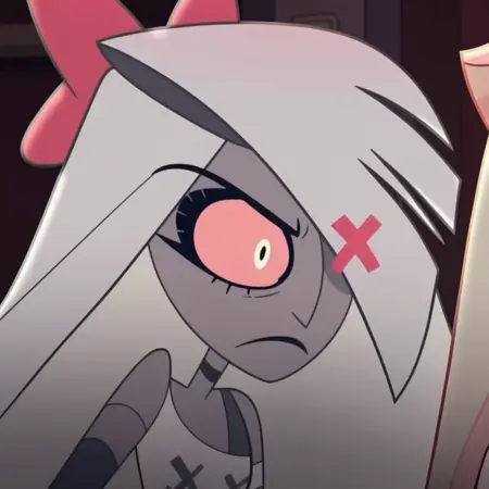 | 训练词汇 | Screencap, 1girl, Vaggie, gray skin, X-shaped eye patch One-eyed, Slim build, Sharp, angular hairstyle, white Hair, Hair over one eye, pastel magenta streak in the end of the hair, salmón Hair ribbon, left elbow glove, left fingerless gloves, right glove, off shoulder dress, grey bra, grey thighighs, left thighighs with pastel magent stripes, grey heels, grey choker已复制! |