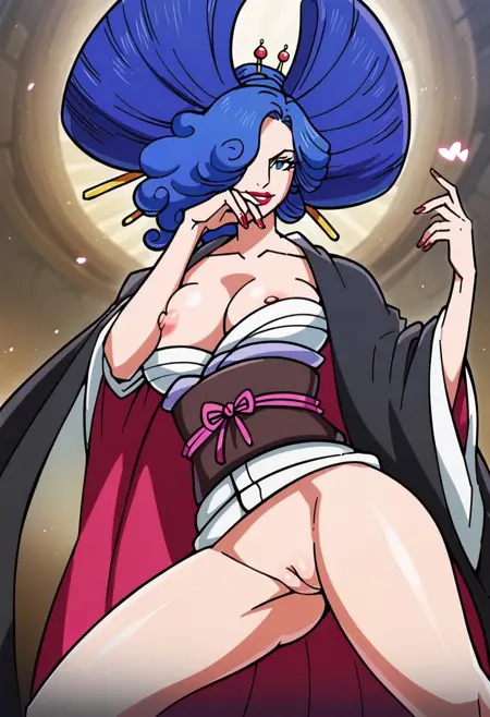 MoonflowerOChoOP, 1소녀, 혼자, 진한 파란 머리카락, 머리 장식, 파란 눈, 입술, 립스틱, 메이크업, 한쪽 눈에 걸친 머리카락, 큰 가슴, 김ono, 일본 복장, 허리띠, 사라시, 오비, 머리 꽂이, 큰 머리카락, 흰색 김ono, 넓은 소매, 옷 장식, 김ono 무늬, 망토, 빨간 손톱, 타비, 옷에 있는 패턴, 신발,