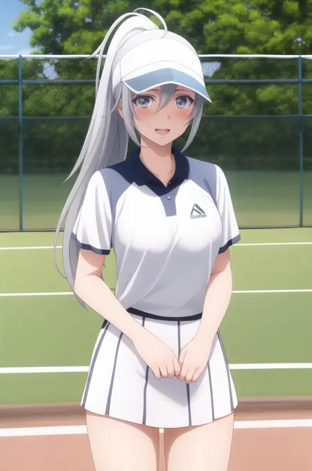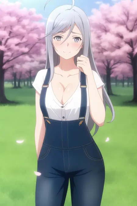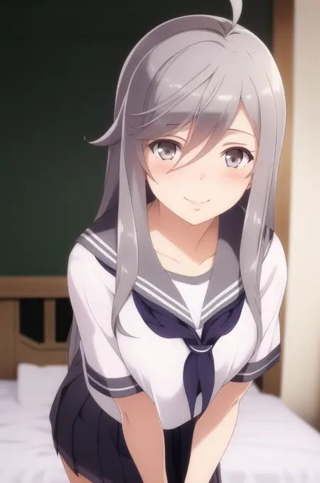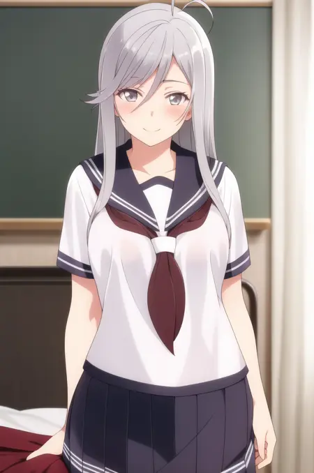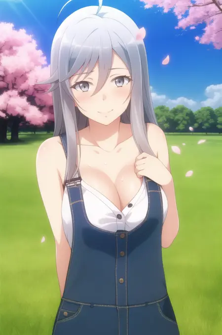 <lora:EightySixLena-v1-01:0.8>, ChopioLena, long hair, grey hair, ahoge, grey eyes, (blush:1.3), (looking at viewer:1.3), 1girl, solo,