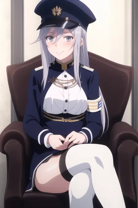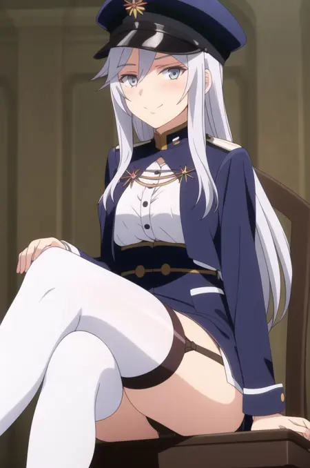 outfit_default, military uniform, high collar, blue jacket, white shirt, long sleeves, armband, white thighhighs, zettai ryouiki, garter straps, peaked cap, military hat, blue headwear, blue footwear