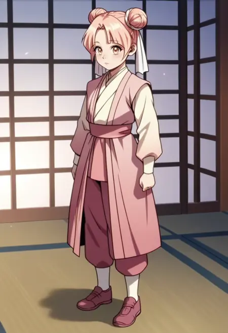 yeomin, brown eyes, pink hair, double bun, hair ribbon,