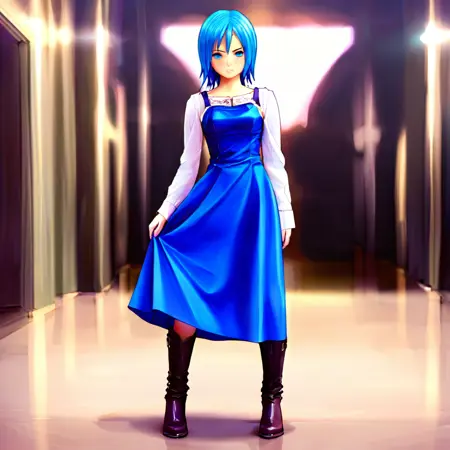 short hair,blue hair,blue eyes,dress,long sleeves,,blue dress,shirt,white shirt,boots