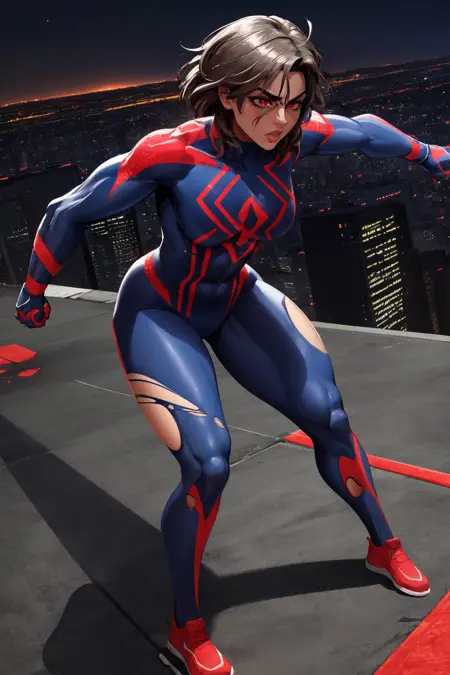 In negative add "Torn bodysuit, cape" or "claws, spider web, spider web print, arm blade" if they gen a bit extreme. The spider logos bleed a little into other outfits but I have yet to figure out a good fix but lowering weight can help.