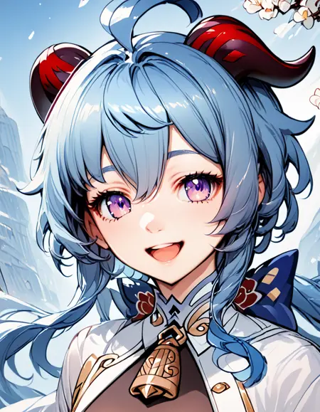 ganyu, horns, ahoge, long hair, blue hair, purple eyes, bell, detached sleeves, bare shoulders, bangs, sidelocks,