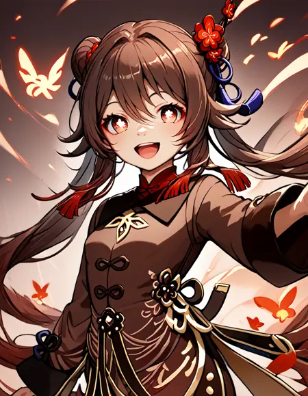 hu_tao, short shorts, navel, brown hair, stomach, red eyes, twintails, thighs, black shorts, long sleeves, open clothes, very long hair, coat,