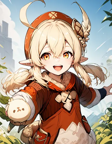 klee, gloves, hat, twintails, red headwear, hat feather, pointy ears, long sleeves, ahoge, bag, long hair, bangs,