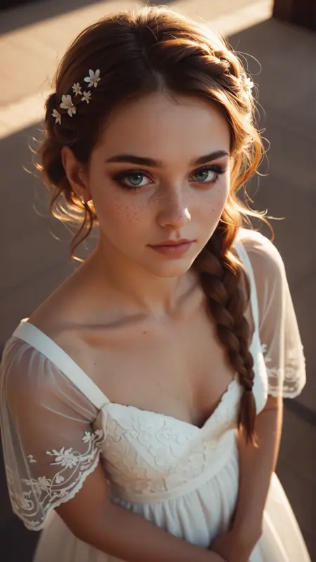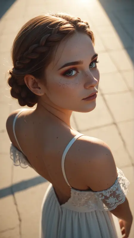 score_9, score_8_up, score_7_up, score_6_up, score_5_up, score_4_up, close up, sfw, face focus, eye view, portrait, freckles, lace dress, marble floors, towering pillars, natural light, semi-sheer robe, timeless, confident gaze, intricate embroidery, angled pose, soft light, rich textures, shoulder curve, velvet backdrop, smooth skin, glossy skin, and hyper-realistic with a luminous sheen, porcelain-like effect, slight gradients, depth, glowing effect, three-dimensional feel, front studio light, mat eyes, warm light, long wavy hair, brown eyes