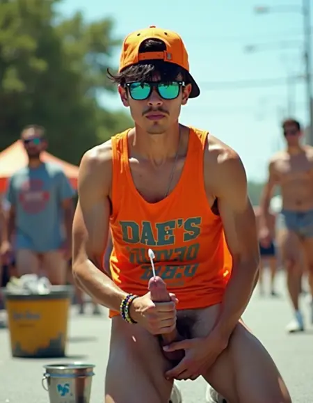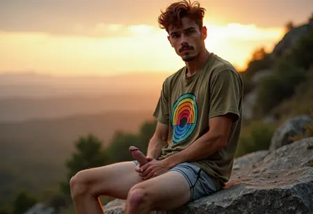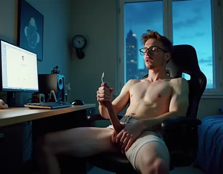 "cutflyingcumFlux", "He is holding his erect penis and having an orgasm" および "he is holding his erect penis, he is having an orgasm, he is jerking off, he is cumming, he is masturbating" — 「魔法の瞬間」にある切開済みのペニスを持つ男性