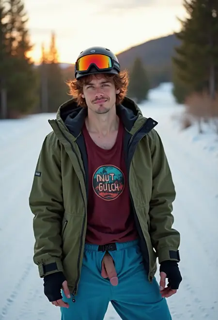 "cutnopantsFlux", "he is not wearing pants" — シャツを着ているがズボンを履いておらず、ペニスが見えている男性