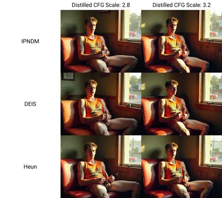 サンプラについては、heun、euler、ipndm、deisは類似の結果を出力し、heunとdeisが推奨されます。Comfy-UIのdpm_adaptiveは同じシードから他のサンプラとは異なる生成結果を出すことが多いため、両方または複数の生成(例:XYプロット)を推奨します。Forge UIではdpm_adaptiveは効果的ではありませんでした。