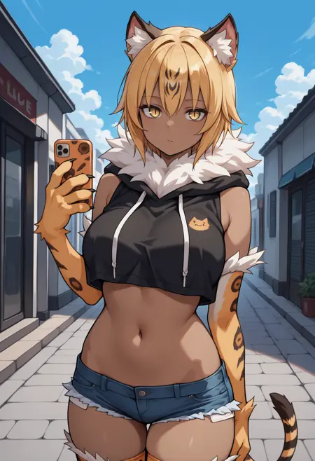 트리거 + 외모: ocelomeh, 검은 피부를 가진 여자, 동물의 손, 발톱, 꼬리, 단발, 금발, 동물 귀, 동물 귀 털, 노란 눈, 수직 동공, 큰 가슴