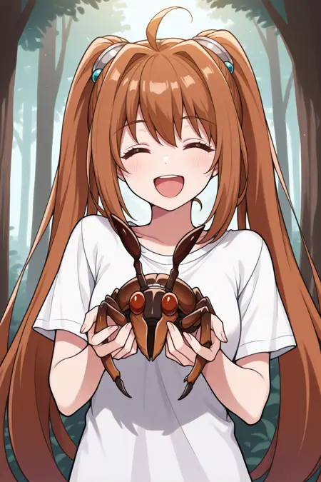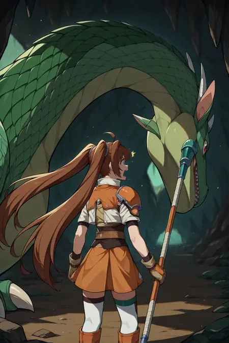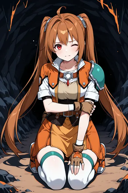 • SC 스타일을 원한다면 "scEstl, 갈색 머리, 매우 긴 머리, 아호게, 트윈테일, 빨간 눈, 짧은 재킷, 주황색 및 흰색 재킷, 짧은 소매, 녹색 어깨패드, 단일 어깨패드, 베이지색 셔츠, 코셋, 주황색 스커트, 벨트, 흰색 허벅지 스타킹, 갈색 장갑, 주황색 부츠"를 추가하세요.