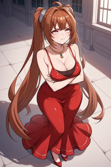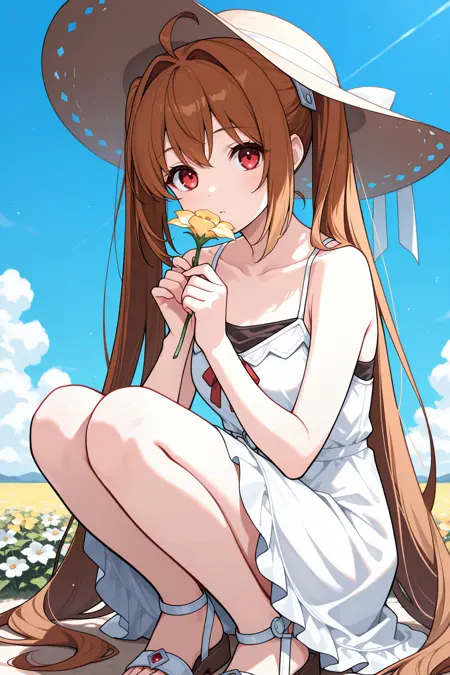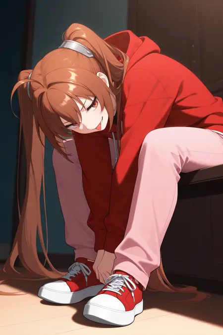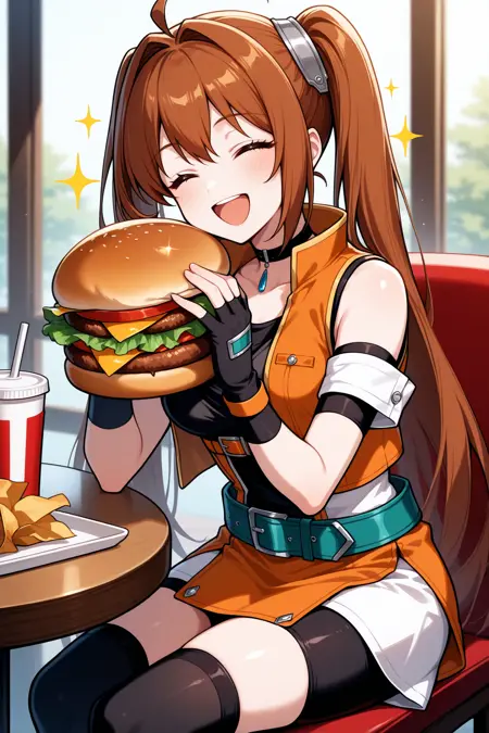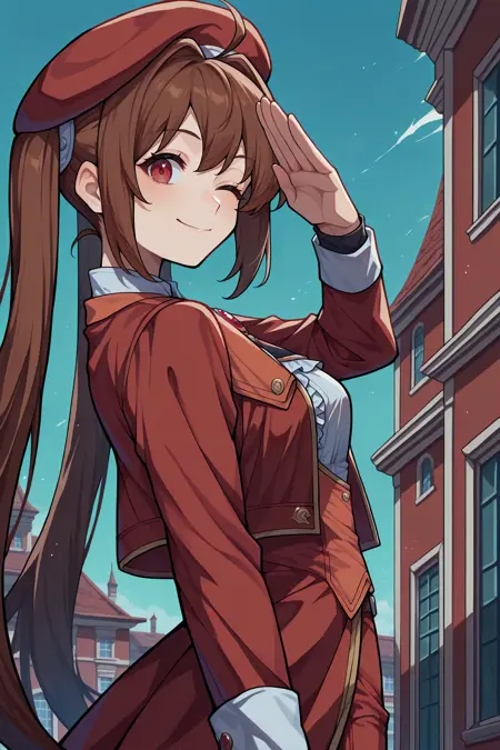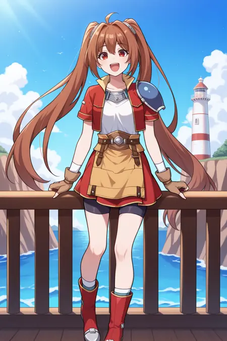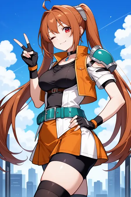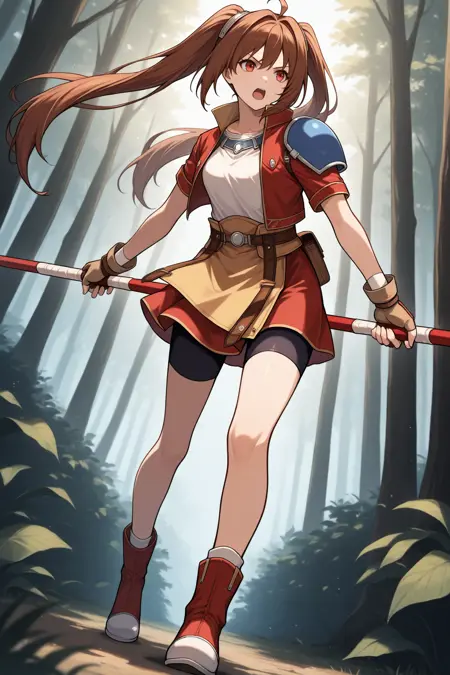 • FC 스타일을 원한다면 "fcEstl, 갈색 머리, 매우 긴 머리, 아호게, 트윈테일, 빨간 눈, 빨간 재킷, 파란 어깨패드, 단일 어깨패드, 흰색 셔츠, 갈색 장갑, 손가락 없음 장갑, 빨간 스커트, 허리 앞치마, 바이크 숏츠, 빨간 부츠"를 추가하세요.