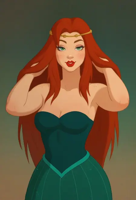 m3rm41d, monster girl, mermaid, red hair, long hair, circlet, freckles, makeup, red lipstick, strapless, green dress, cleavage,