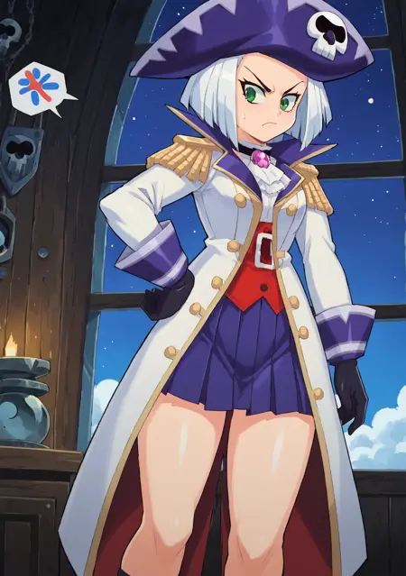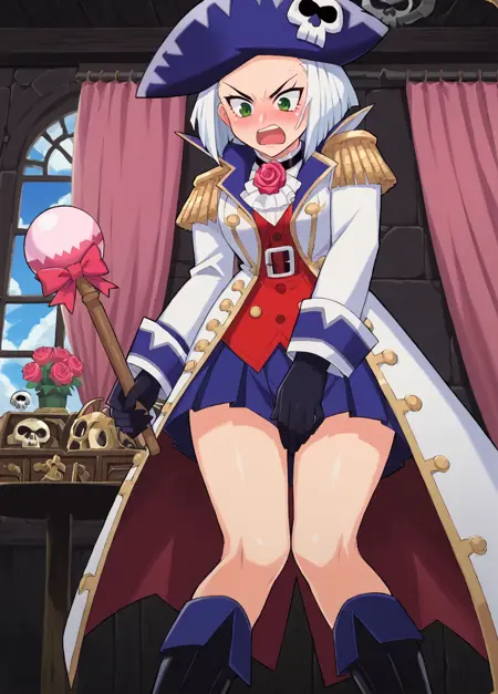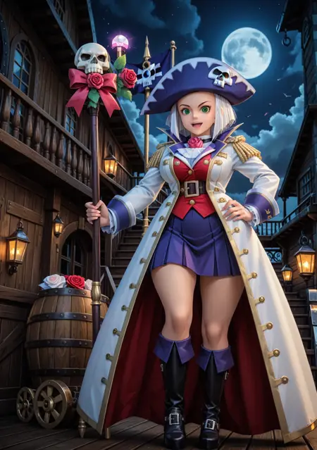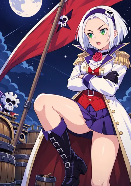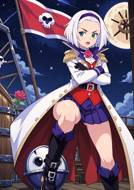 White coat, gold trimmings, Pirate Hat (or purple hairband), white cravat, rose, epaulettes, red shirt, waist belt, miniskirt, pleated skirt, black gloves, black footwear, knee boots, boot buckle