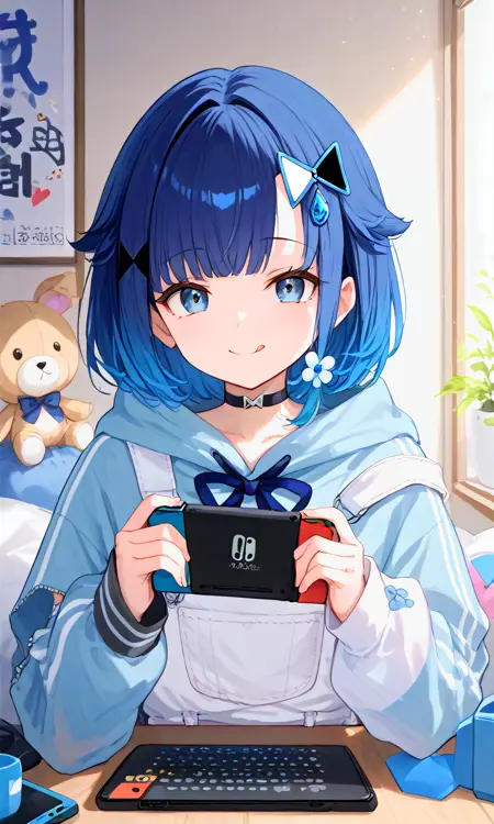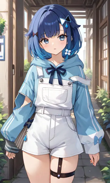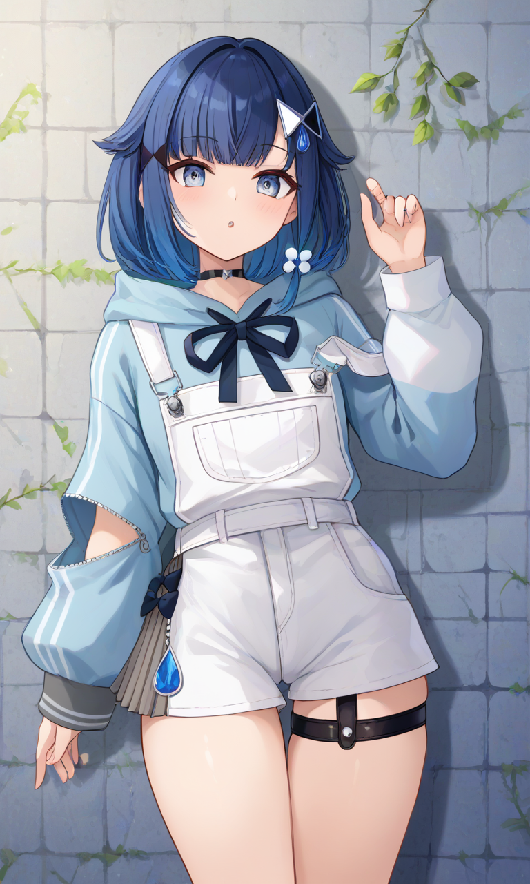 tsumugi kokage, blue hair, short hair, hair ornament, hair flower, choker, hoodie, white overalls, overall shorts, thigh strapRecommended Weight : 0.7~1