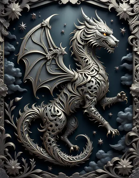 dimtlsclptr(例:A highly detailed silver dimtlsclptr of a dragon)他の有効なトークン:metallic ribbons(金属のリボン)、metal sculpted(金属で彫刻された)、gleaming(きらめく)、intricate patterns(複雑な模様)。動物タイプの対象が特にうまく機能します。